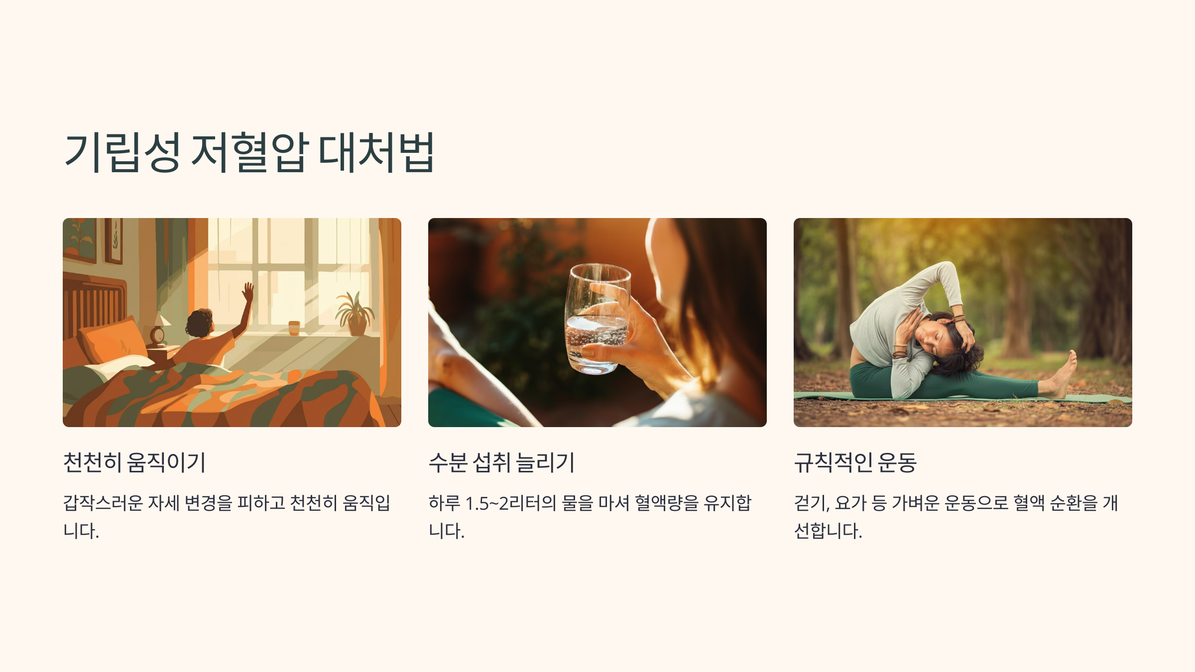 기립성 저혈압은 단순한 어지럼증으로 여길 수 있지만, 반복될 경우 심각한 사고나 건강 문제를 유발할 수 있습니다. 원인을 파악하고 적절히 대처하면 증상을 완화할 수 있습니다. 천천히 움직이고, 충분한 수분을 섭취하며, 정기적으로 건강 상태를 점검해보세요. 지속적으로 증상이 나타나면 반드시 의사와 상담하여 적절한 치료를 받으세요.