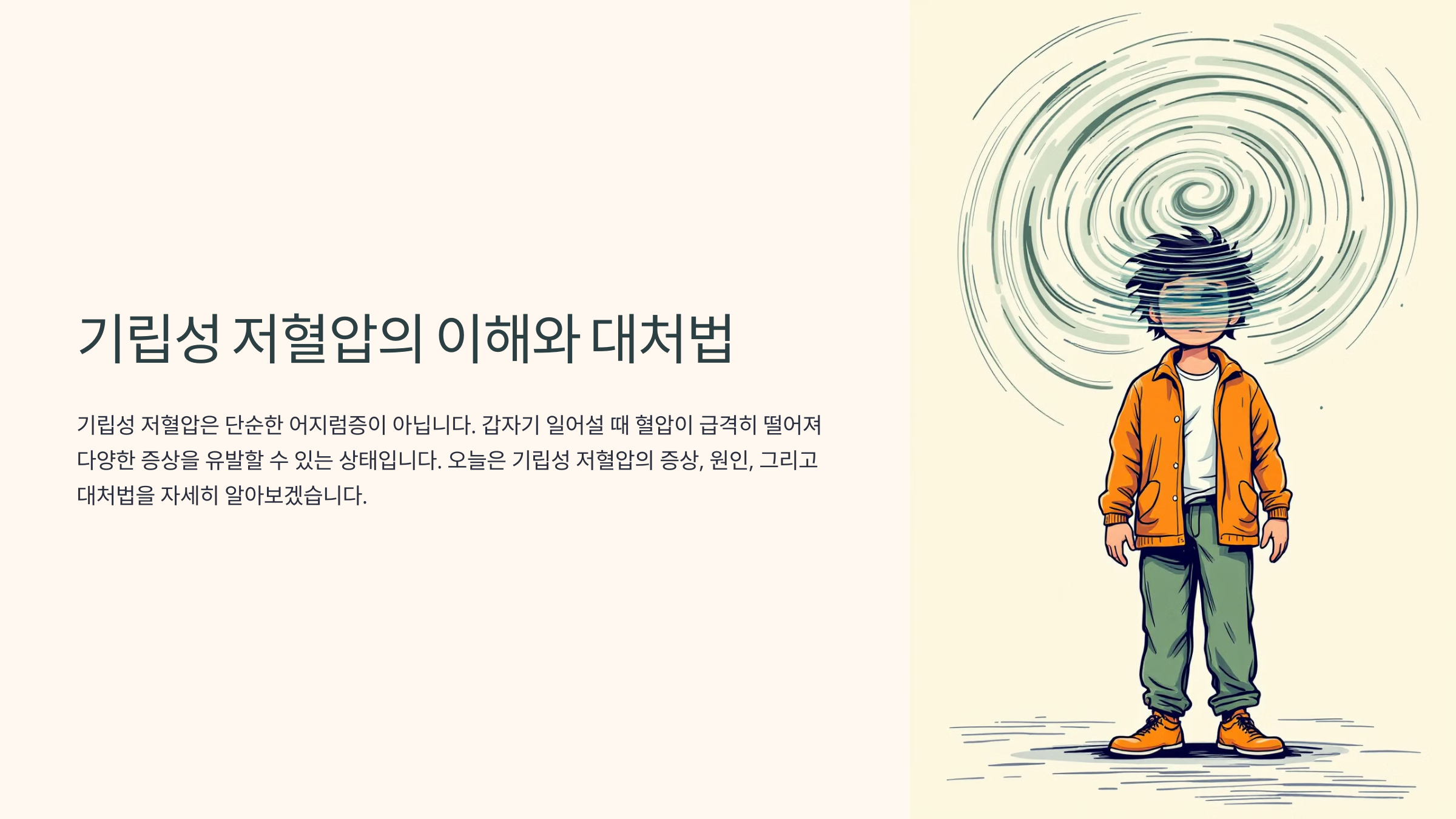 기립성 저혈압은 앉거나 누워 있다가 갑자기 일어설 때 혈압이 급격히 떨어지는 상태를 말합니다. 이는 뇌로 가는 혈류가 부족해 어지럼증, 실신 등 다양한 증상을 유발할 수 있습니다. 단순한 증상으로 여길 수 있지만, 반복되면 일상생활에 지장을 줄 뿐만 아니라 심각한 사고로 이어질 수 있습니다. 오늘은 기립성 저혈압의 증상과 어지럼증의 원인, 그리고 대처법을 자세히 알아보겠습니다.