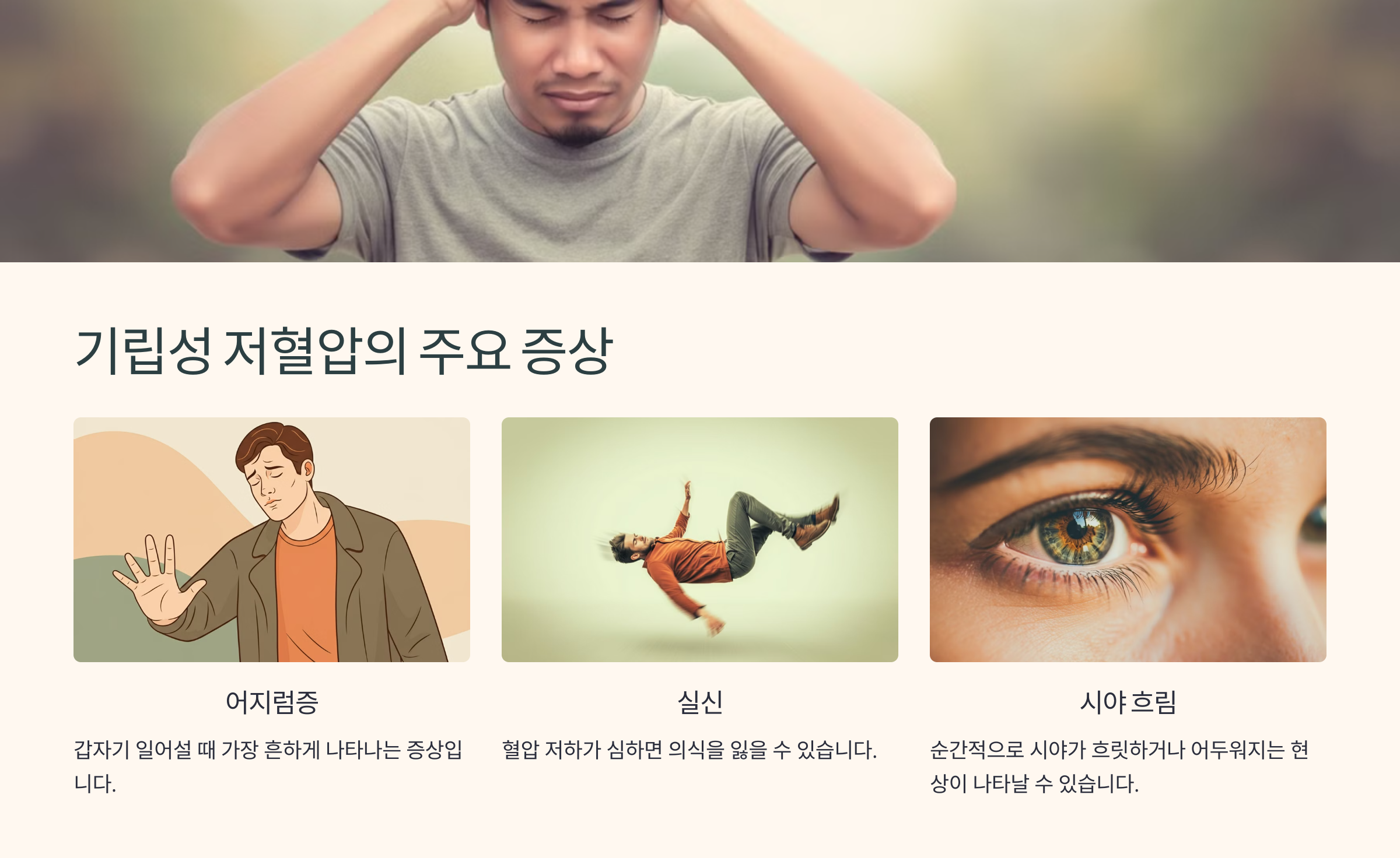 - 자주 반복되는 기립성 저혈압은 신경계 또는 심혈관계 문제일 수 있으므로, 전문가의 도움을 받아야 합니다.