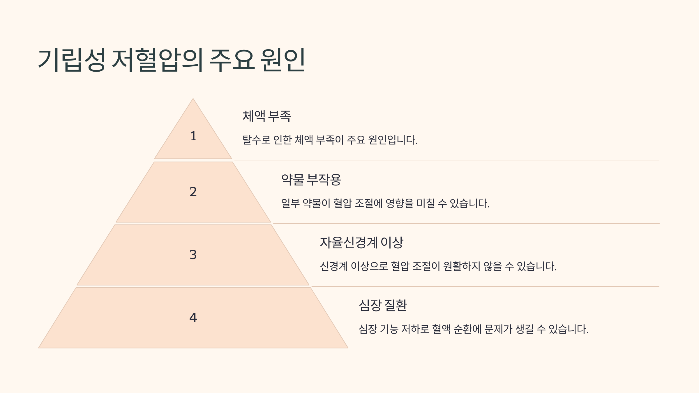 - 기립성 저혈압은 체위 변화(앉거나 누운 상태에서 일어설 때)로 인해 혈압이 급격히 떨어지는 상태입니다.