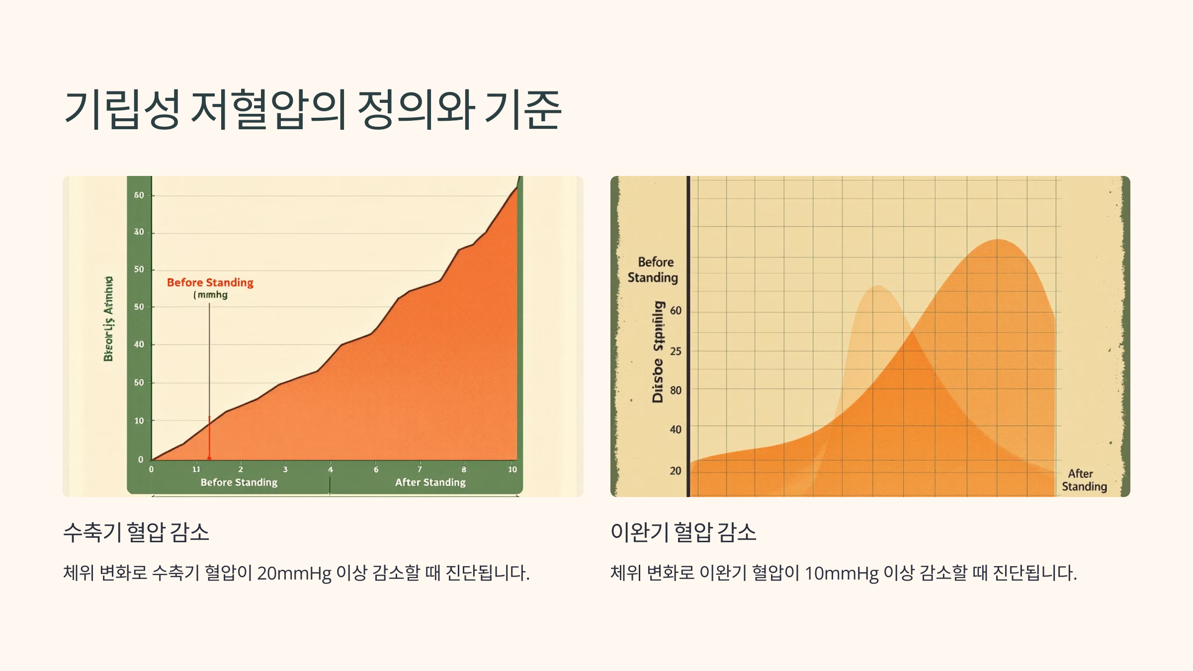 - 기립성 저혈압은 체위 변화(앉거나 누운 상태에서 일어설 때)로 인해 혈압이 급격히 떨어지는 상태입니다.