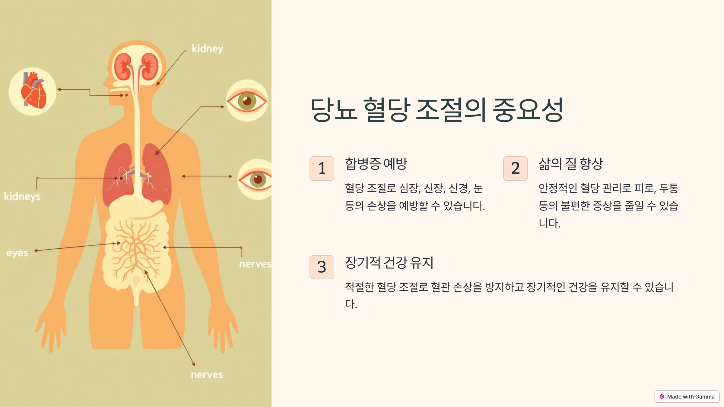 - 정확한 사용법: 약물과 인슐린은 의사의 처방을 정확히 따라야 하며, 자가조절보다는 전문가의 지도 아래 사용해야 합니다.