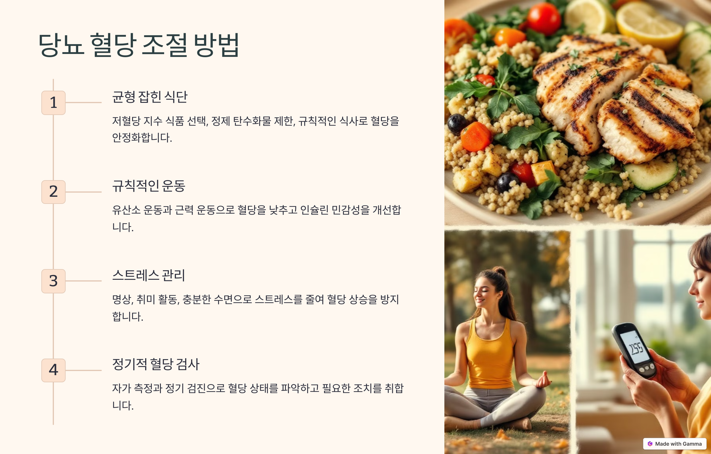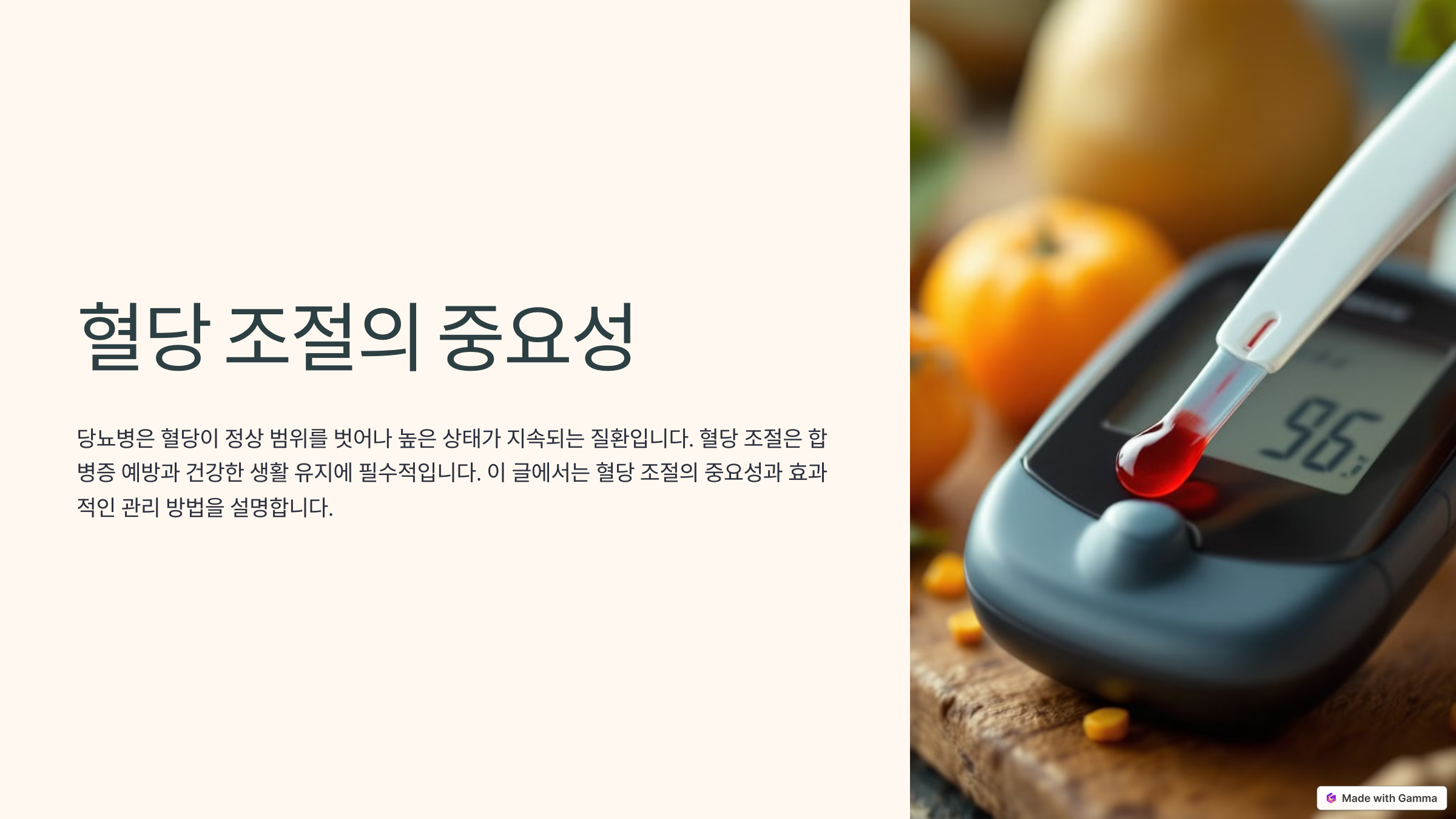 혈당 조절은 당뇨 환자의 건강을 유지하는 데 가장 중요한 요소입니다. 식단, 운동, 스트레스 관리, 정기 검사를 통해 꾸준히 혈당을 모니터링하고 조절하면 합병증을 예방하고 건강한 생활을 유지할 수 있습니다. 당뇨는 꾸준한 관리가 필요한 만성 질환이므로, 생활 습관 개선과 정기적인 검진을 통해 장기적으로 건강한 삶을 이어나가길 바랍니다.