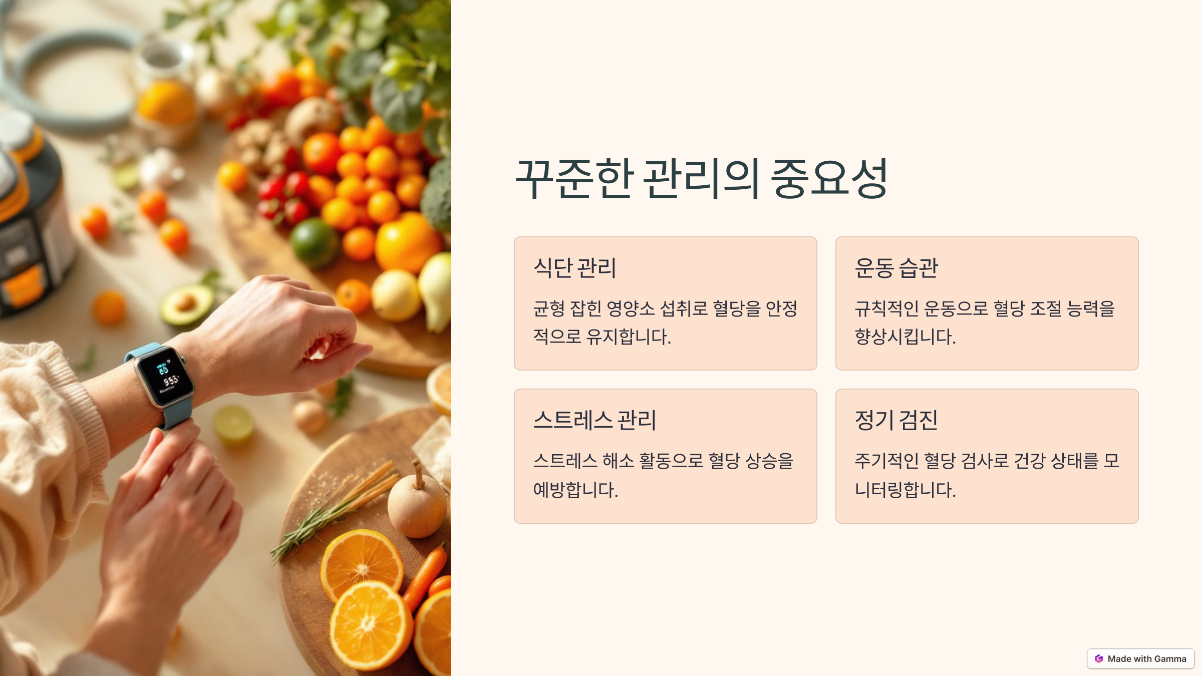 - 균형 잡힌 영양소 섭취: 단백질과 건강한 지방을 포함해 혈당을 안정적으로 유지할 수 있는 식단을 구성하는 것이 좋습니다.