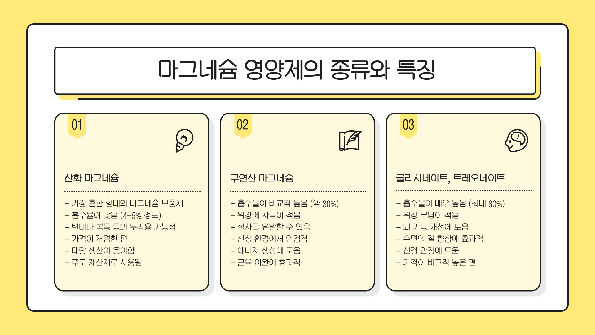 - 산화 마그네슘: 흡수율 낮고 변비나 복통 유발 가능