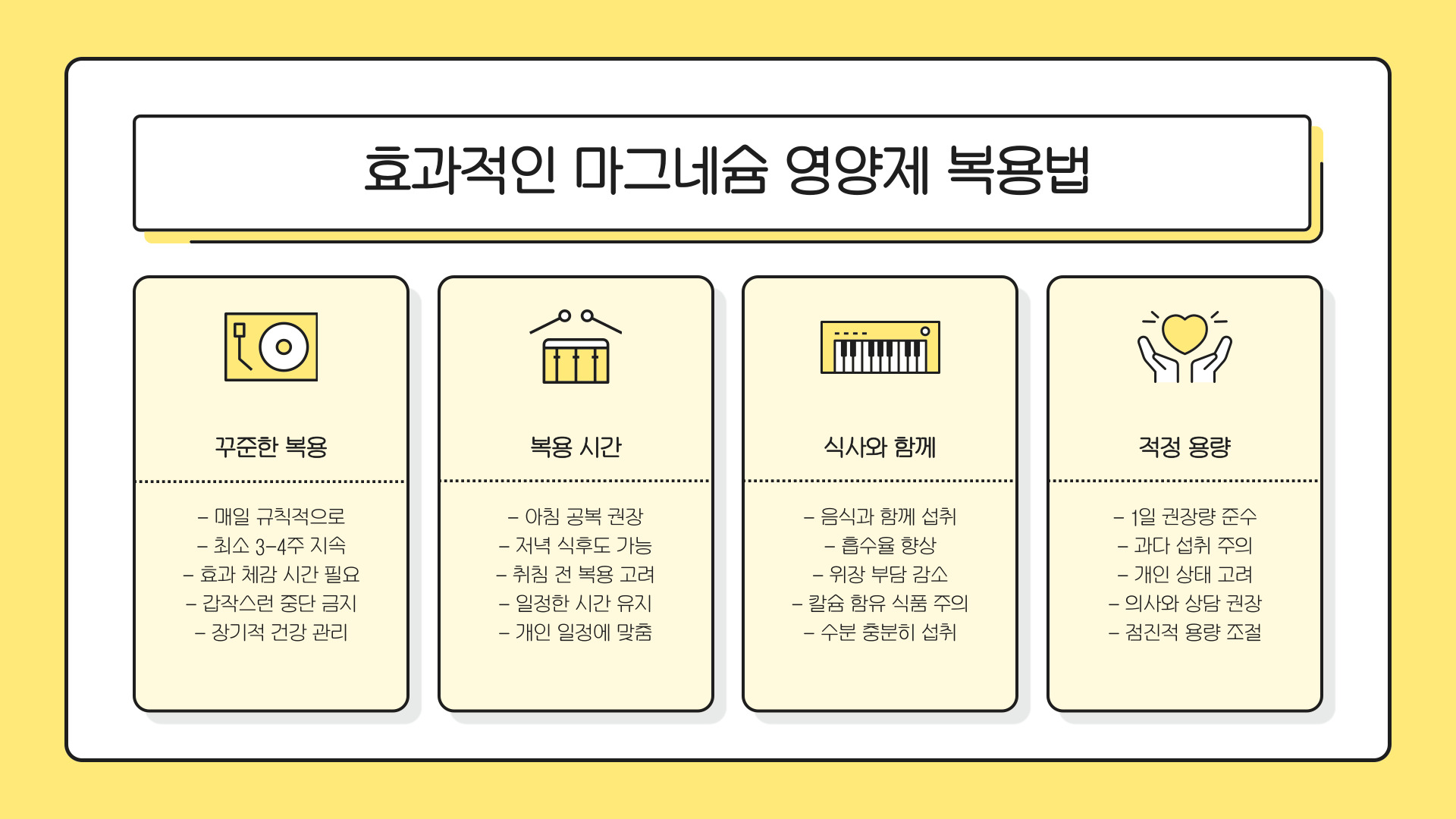 마그네슘 영양제는 꾸준히, 같은 시간에 복용하는 게 핵심입니다.