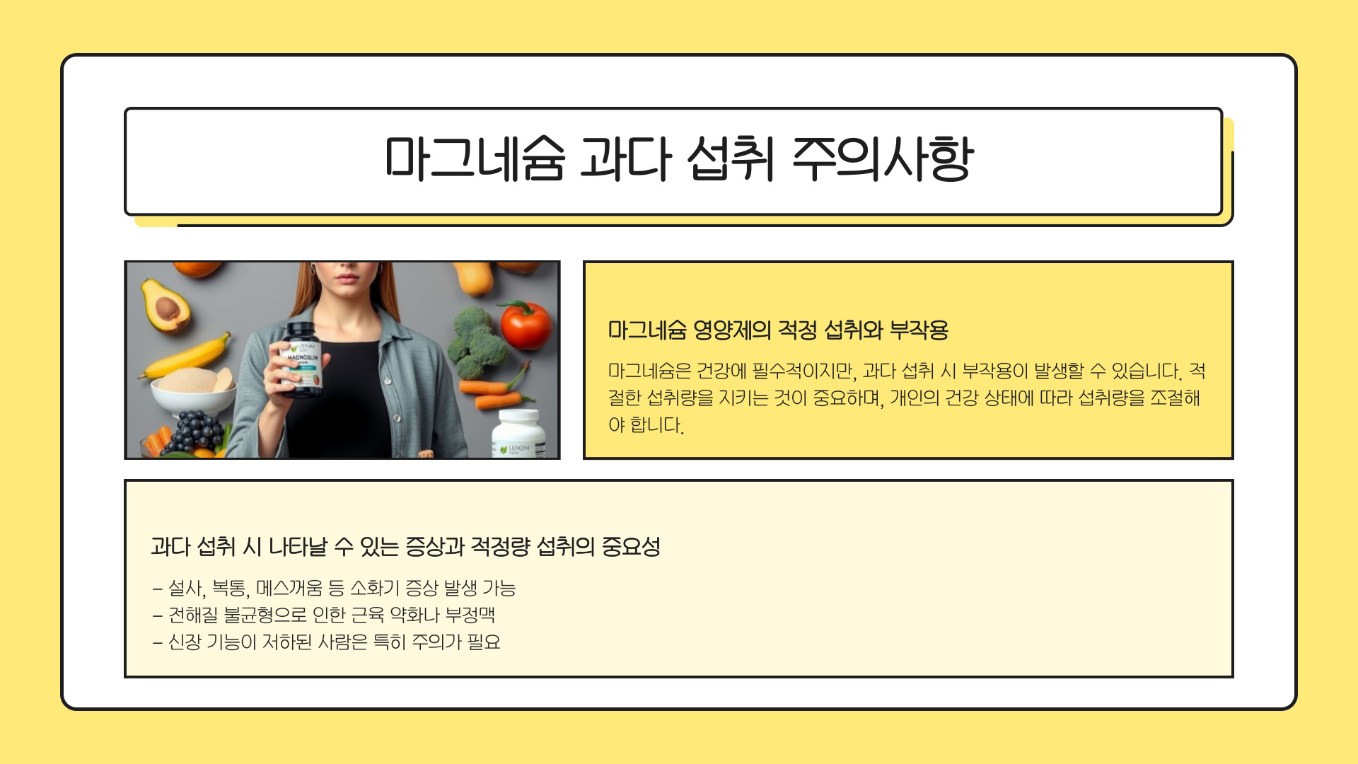 - 산화 마그네슘: 흡수율 낮고 변비나 복통 유발 가능
