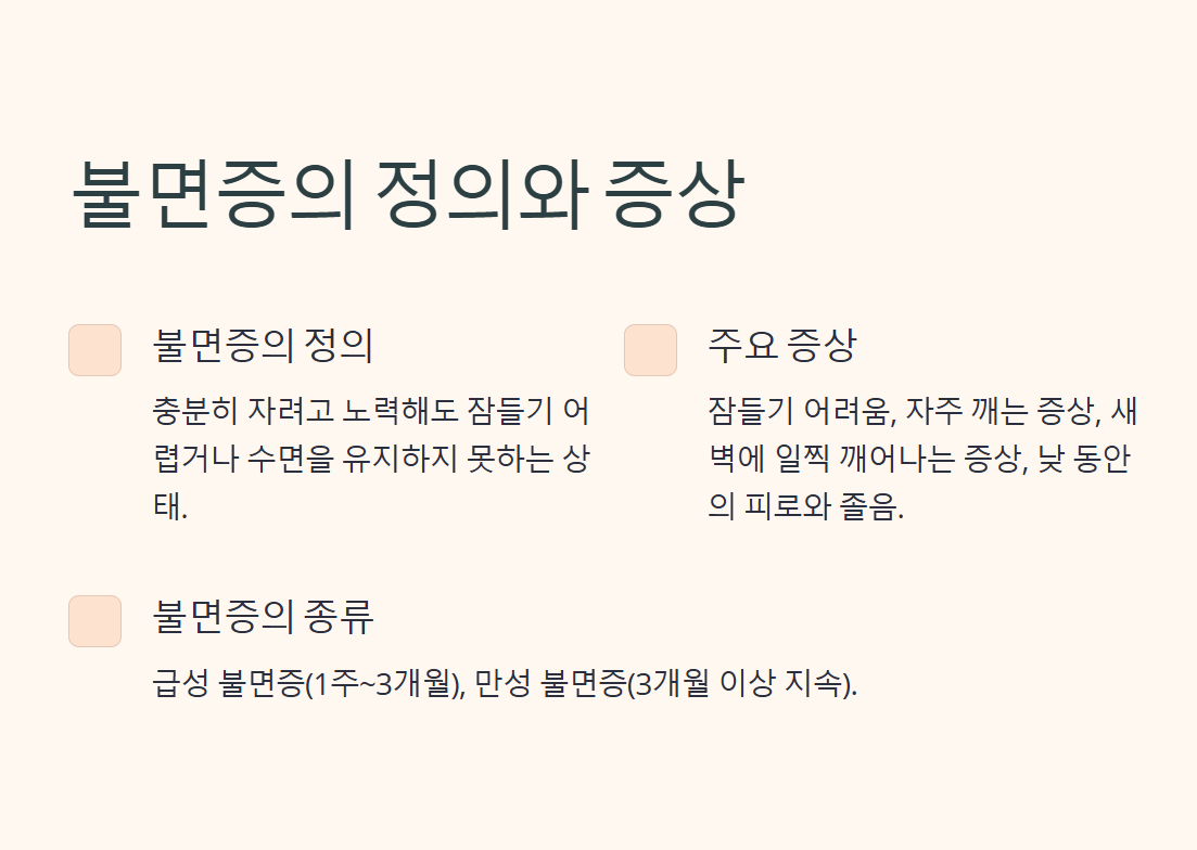 불면증은 충분히 자려고 노력해도 잠들기 어렵거나 수면을 유지하지 못하는 상태를 말합니다.