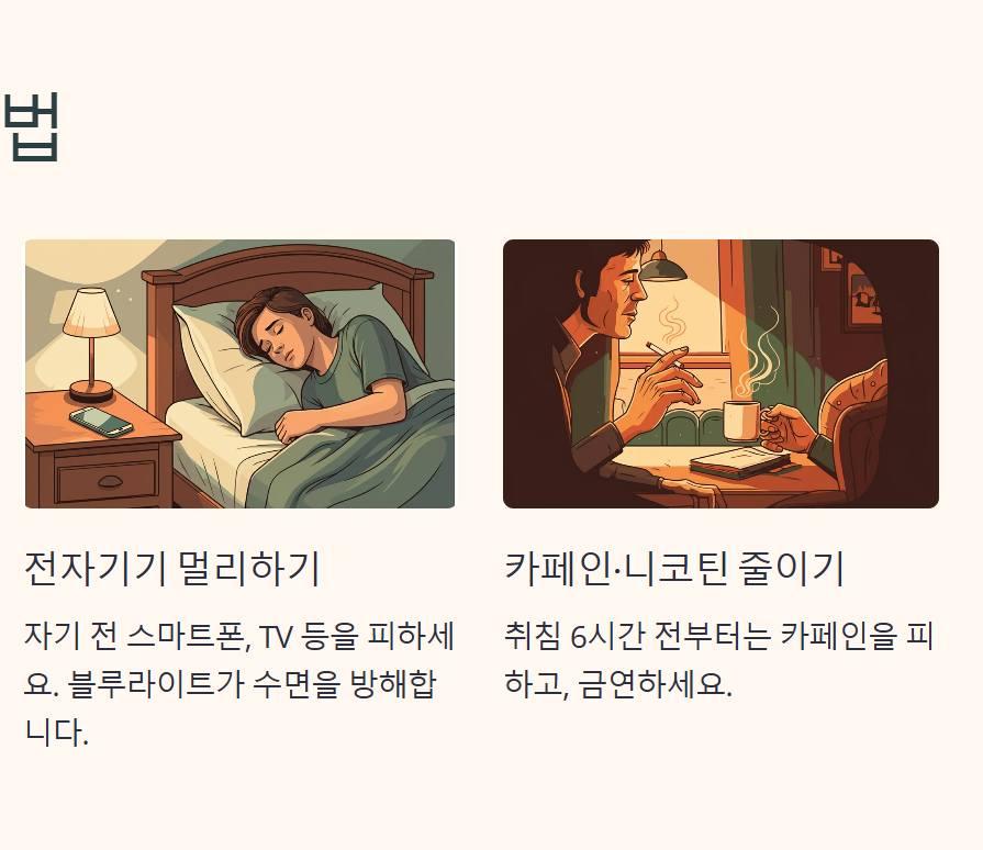 - 늦은 밤까지 스마트폰을 사용하거나 카페인을 섭취하는 등 불규칙한 생활습관은 수면 리듬을 깨뜨립니다.