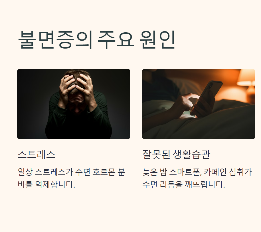 - 스트레스가 지속되면 수면호르몬(멜라토닌) 분비가 억제되어 잠들기 어려워집니다.