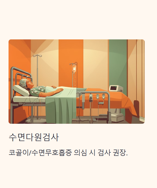 - 코골이나 수면 무호흡증 같은 다른 수면장애가 의심될 경우, 수면다원검사를 통해 원인을 진단받으세요.