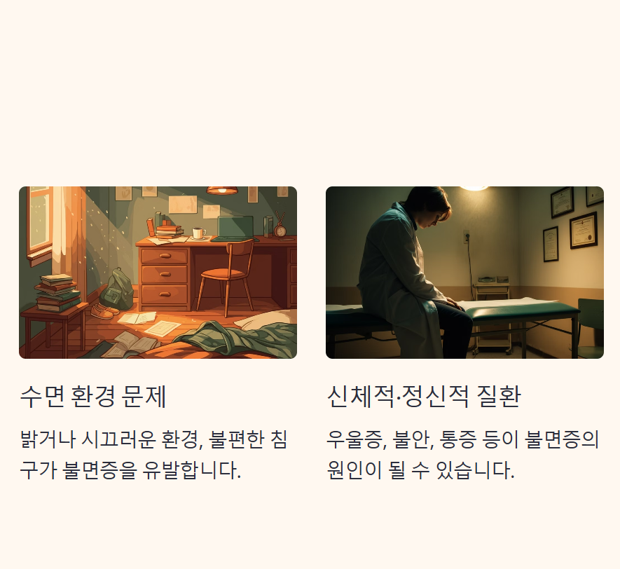 - 너무 밝거나 시끄러운 환경, 불편한 침구 등이 불면증을 유발할 수 있습니다.