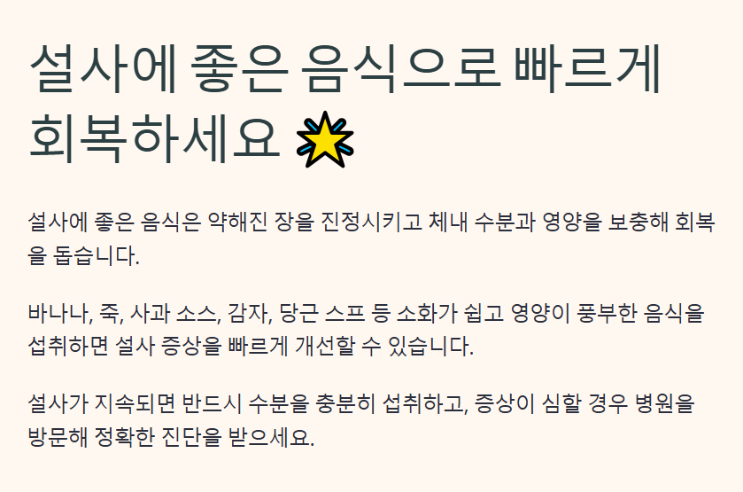 - 설사로 약해진 장을 부담스럽게 하지 않도록 소화가 잘 되는 부드러운 음식이 필요합니다.