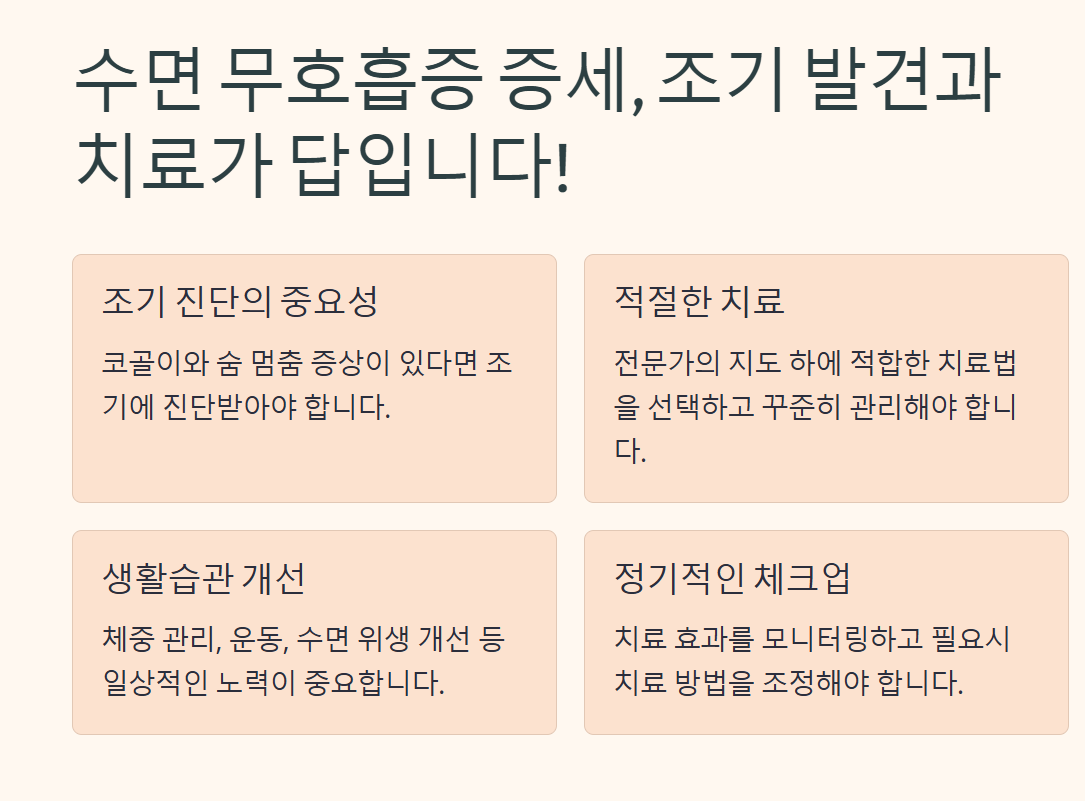수면 무호흡증 증세는 단순히 수면 중 불편함으로 끝나는 것이 아니라, 심각한 건강 문제로 이어질 수 있습니다. 특히 코골이와 함께 숨이 멈추는 증상이 있다면 조기에 진단을 받고 적절한 치료를 시작해야 합니다. 양질의 수면은 건강한 삶의 기본입니다. 수면 무호흡증 증세를 놓치지 말고 적극적으로 관리하여 더 나은 삶을 만들어 보세요!