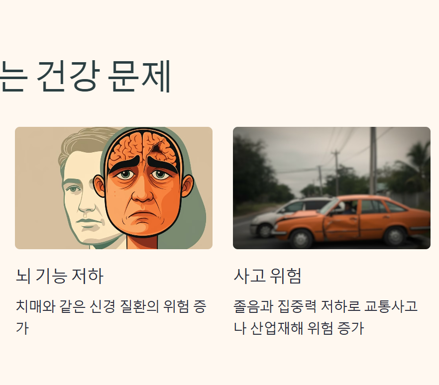 - 업무나 학업 능률이 저하되며, 사고를 유발할 위험도 높아집니다.
