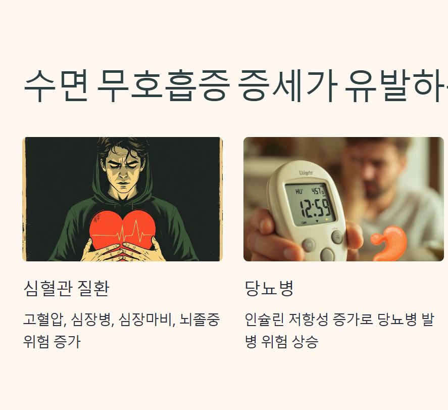 - 수면 무호흡증은 신체의 인슐린 저항성을 높여 당뇨병 발병 위험을 증가시킵니다.