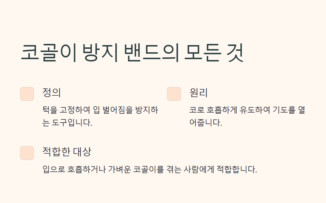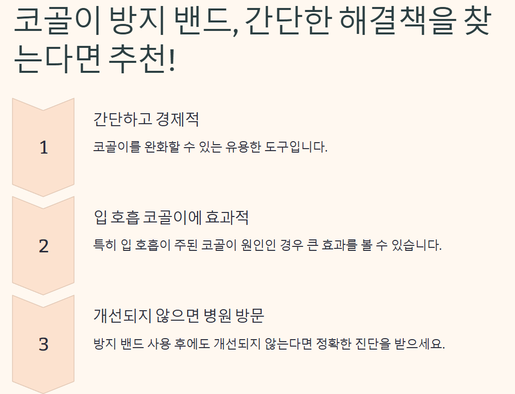 코골이 방지 밴드는 간단하고 경제적인 방법으로 코골이를 완화할 수 있는 유용한 도구입니다. 특히 입 호흡이 주된 코골이 원인인 경우 큰 효과를 볼 수 있습니다. 그러나 코골이의 원인은 다양하므로, 방지 밴드 사용 후에도 개선되지 않는다면 병원을 방문해 정확한 진단을 받아야 합니다. 코골이 문제를 해결하고 더 나은 수면 환경을 만들어 건강한 삶을 누리세요.