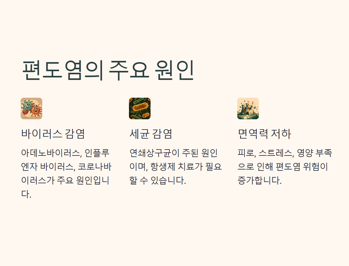 - 피로, 스트레스, 영양 부족 등으로 인해 면역력이 약해지면 편도염 발생 위험이 증가합니다.