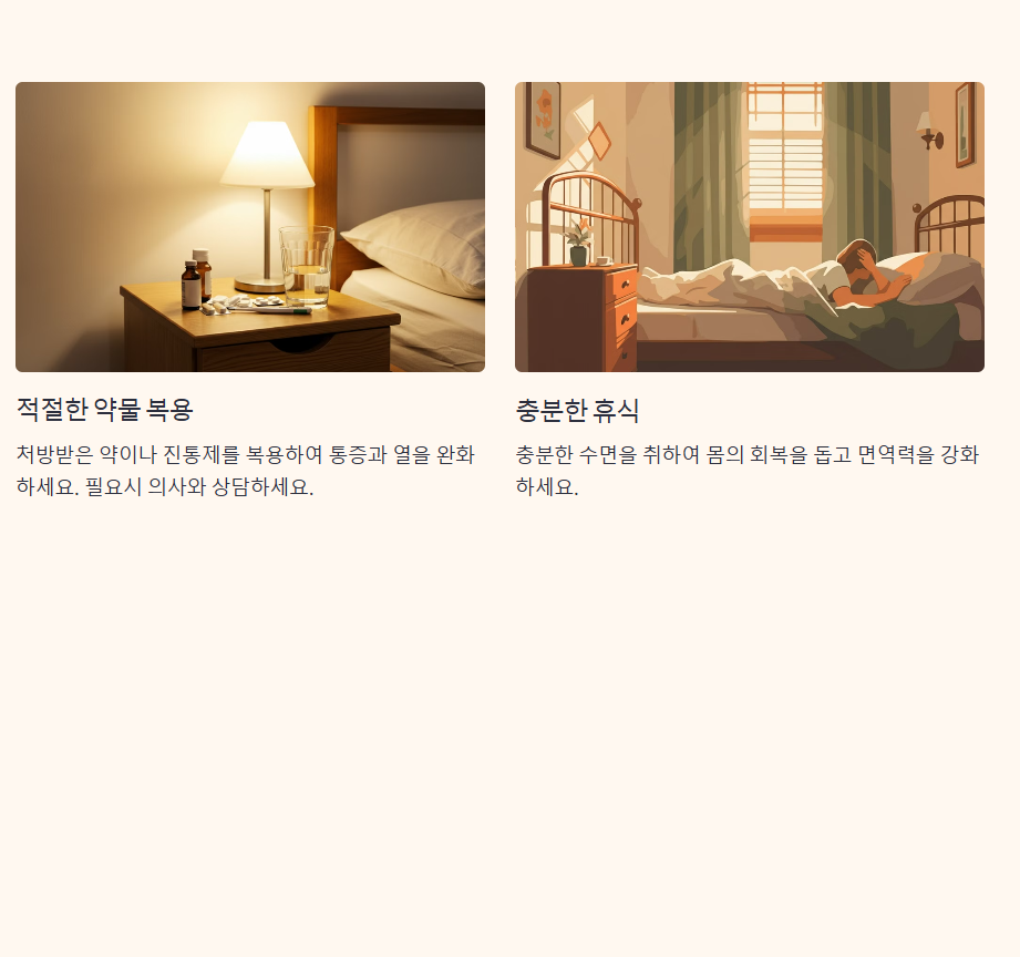 - 발열과 통증을 완화하기 위해 아세트아미노펜이나 이부프로펜을 복용하세요.