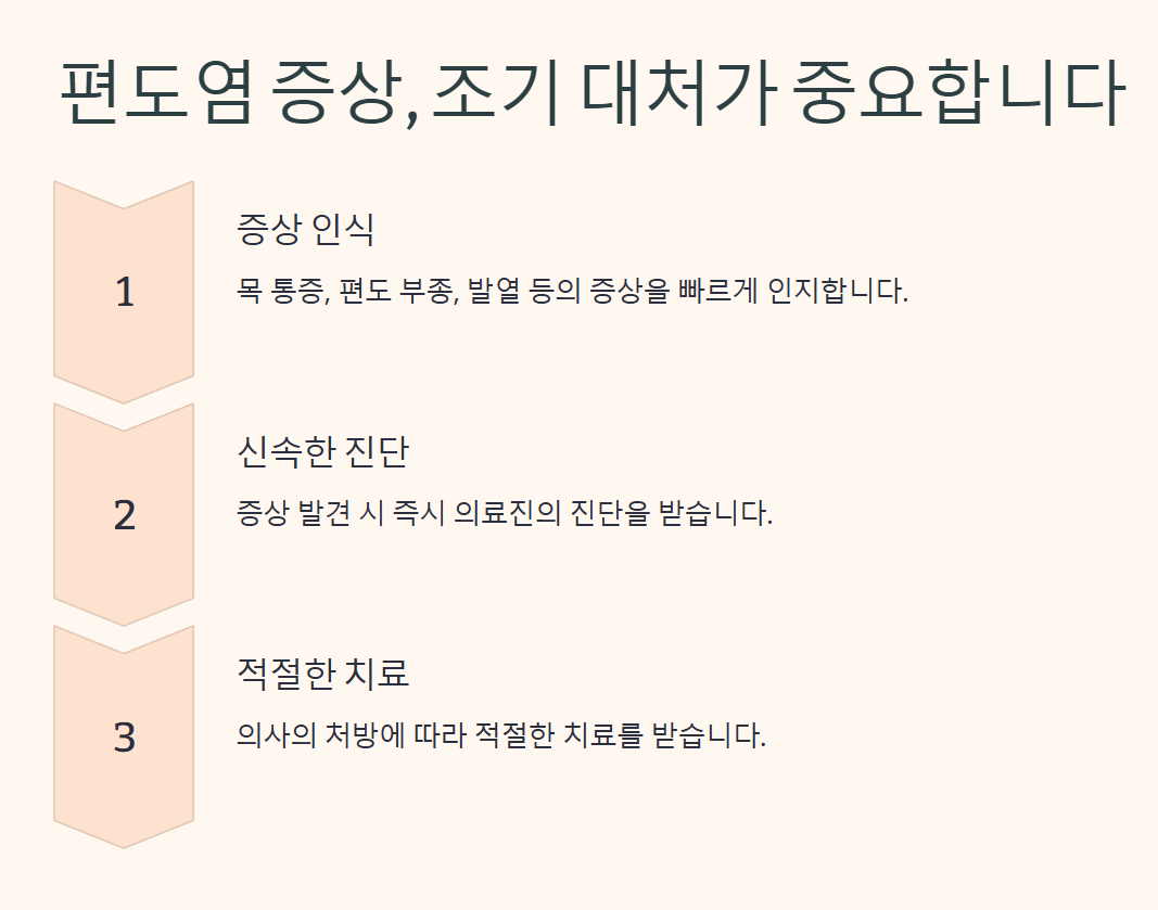 - 합병증으로는 편도 주위 농양, 호흡 곤란, 폐렴 등이 발생할 수 있으므로 조기에 치료하는 것이 중요합니다.