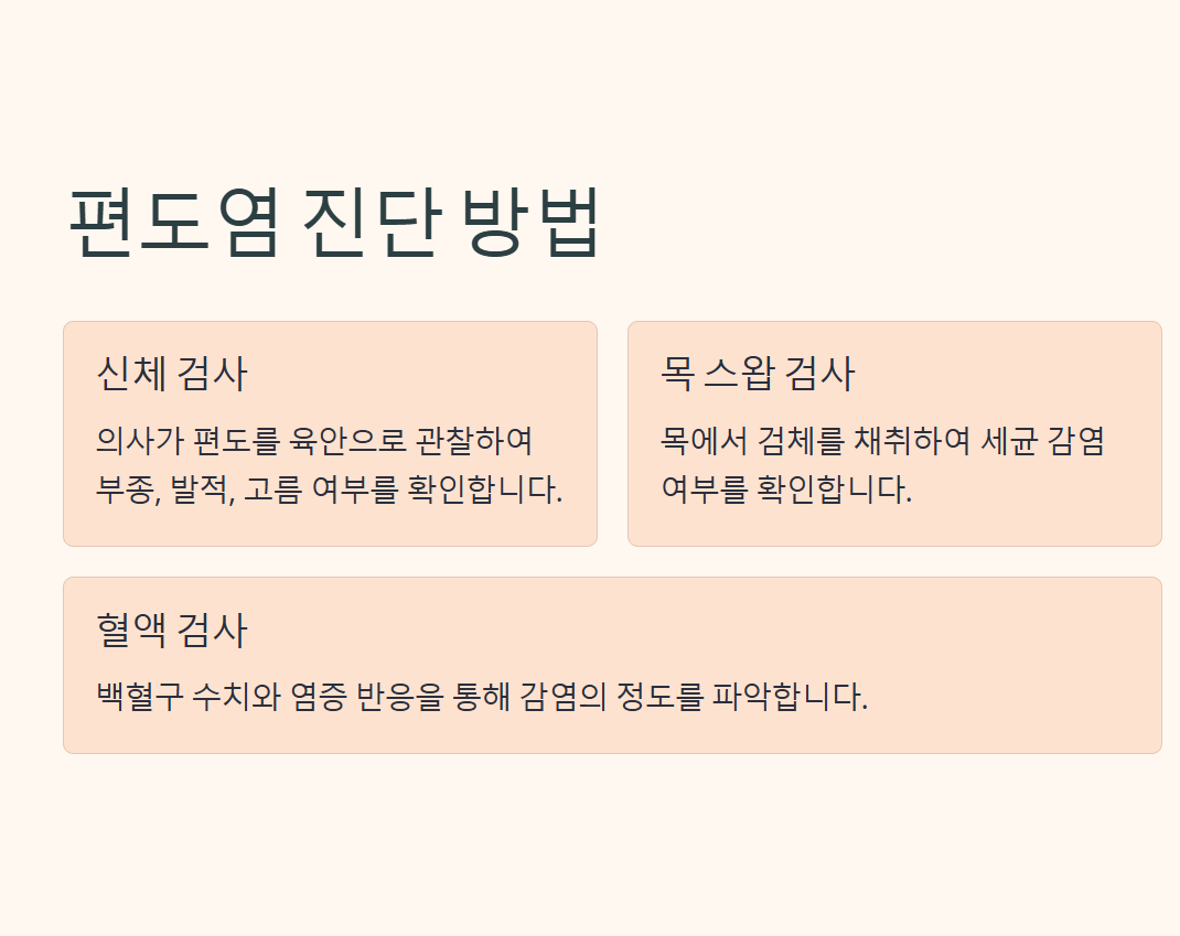 - 의사가 편도를 육안으로 관찰하여 부종, 발적, 고름 여부를 확인합니다.