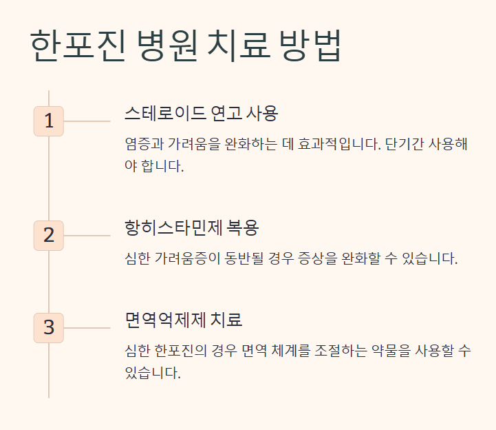 - 심한 한포진의 경우 면역 체계를 조절하는 약물(예: 타크로리무스 연고)을 사용할 수 있습니다.