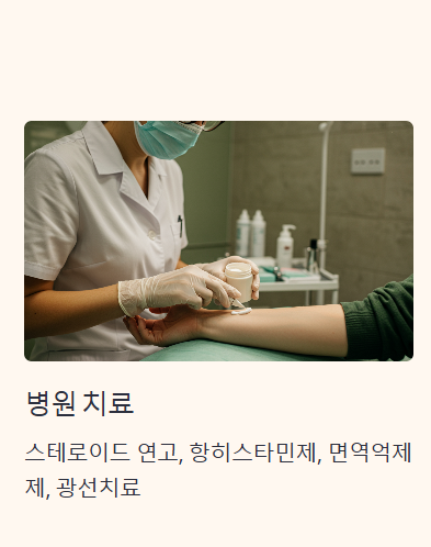✅ 병원 치료: 스테로이드 연고, 항히스타민제, 면역억제제, 광선치료 활용