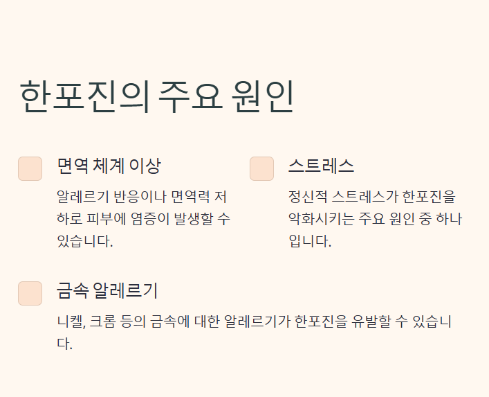 - 스트레스: 정신적 스트레스가 한포진을 악화시키는 주요 원인 중 하나입니다.