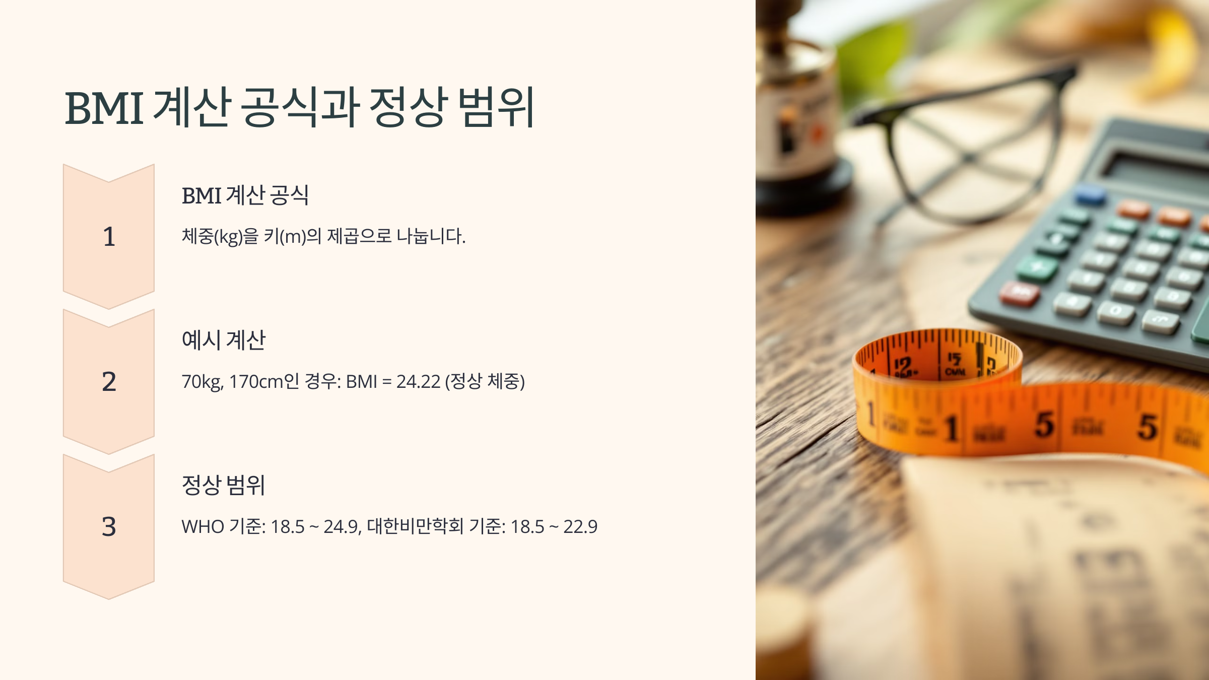 BMI는 간단하면서도 효과적인 건강 지표로, 체중 관리를 시작하는 데 유용합니다. 하지만 개인별 체질과 신체 상태를 고려해 BMI 수치를 보조 지표로 활용하고, 체지방률, 허리둘레 등 추가적인 건강 지표를 함께 점검하세요. 정상 BMI 범위를 유지하며 건강한 삶을 누리시길 바랍니다.