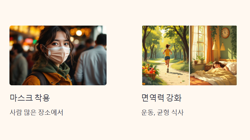 - 규칙적인 운동과 균형 잡힌 식사를 통해 면역 체계를 강화하세요.